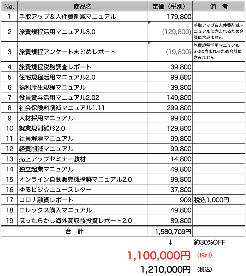 例えば旅費規程活用マニュアル3.0だけ持っている場合は、旅費規程活用マニュアル3.0の定価、129,800円×90%の116,820円を上記合計金額から差し引きます。