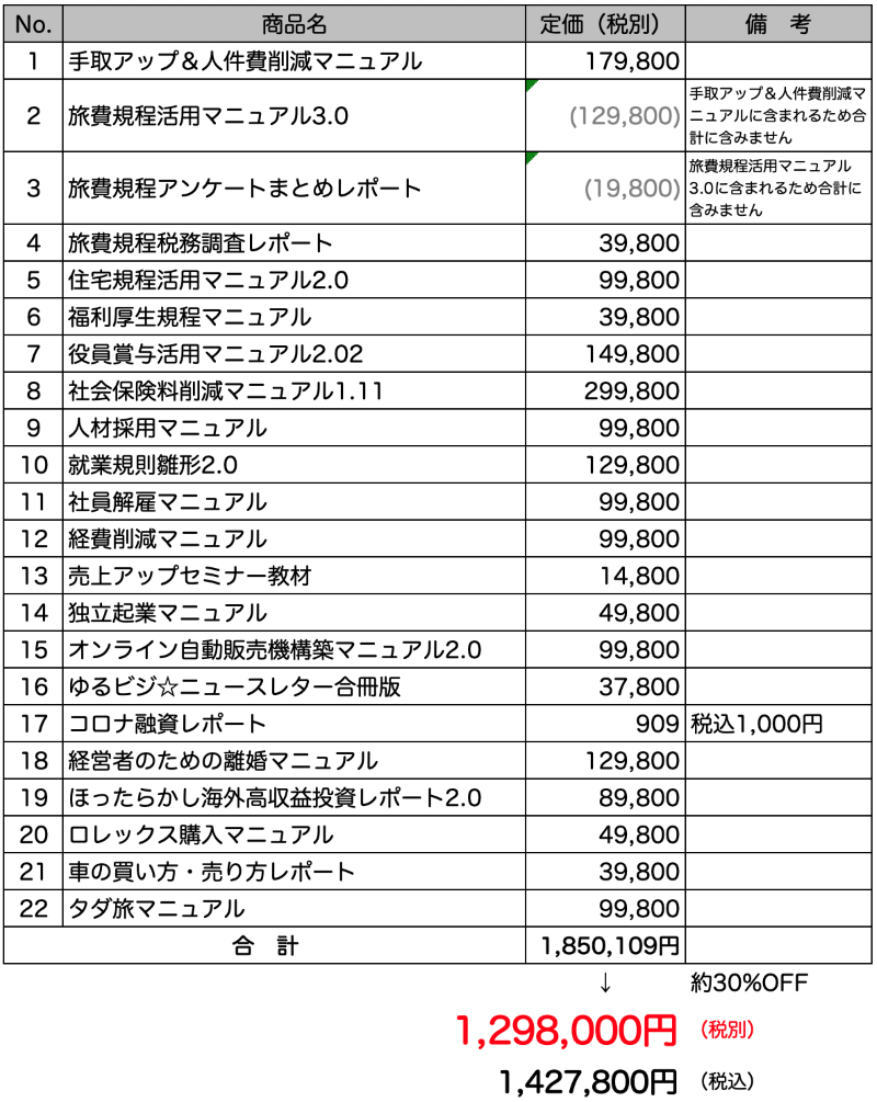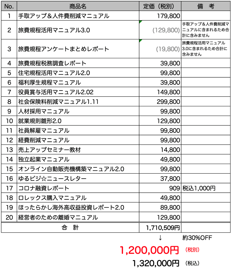 例えば旅費規程活用マニュアル3.0だけ持っている場合は、旅費規程活用マニュアル3.0の定価、129,800円×90%の116,820円を上記合計金額から差し引きます。